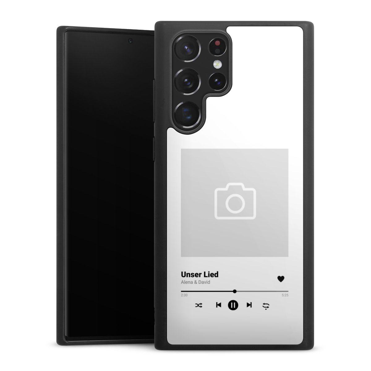 We print your design on the back of the glass inlay and then connect it firmly to the silicone case ,so that nothing sticks out and everything looks like it was cast from one piece. In addition, the sturdy glass element is protected from scratches by an additional coating and ensures a slight reflection on the shiny print image.