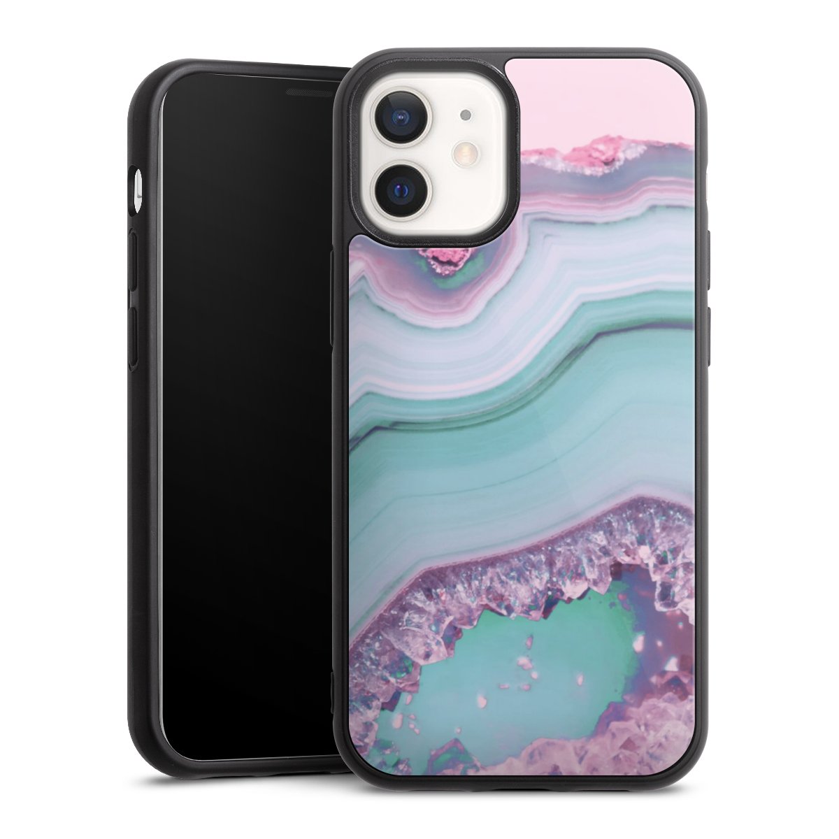 We print your design on the back of the glass inlay and then connect it firmly to the silicone case ,so that nothing sticks out and everything looks like it was cast from one piece. In addition, the sturdy glass element is protected from scratches by an additional coating and ensures a slight reflection on the shiny print image.