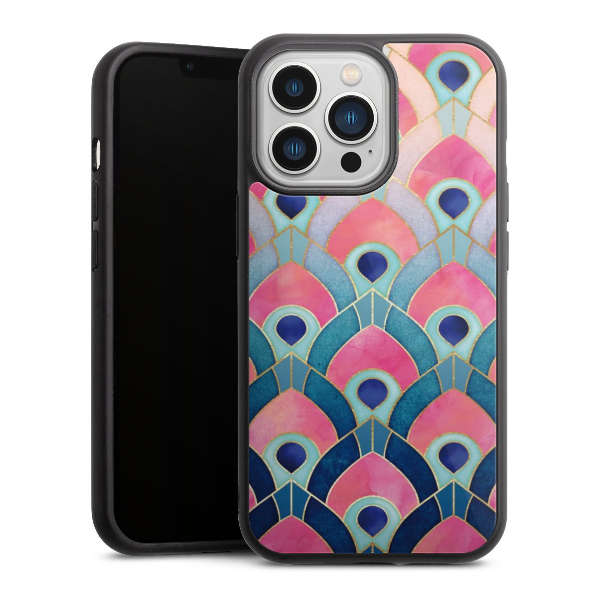 We print your design on the back of the glass inlay and then connect it firmly to the silicone case ,so that nothing sticks out and everything looks like it was cast from one piece. In addition, the sturdy glass element is protected from scratches by an additional coating and ensures a slight reflection on the shiny print image.