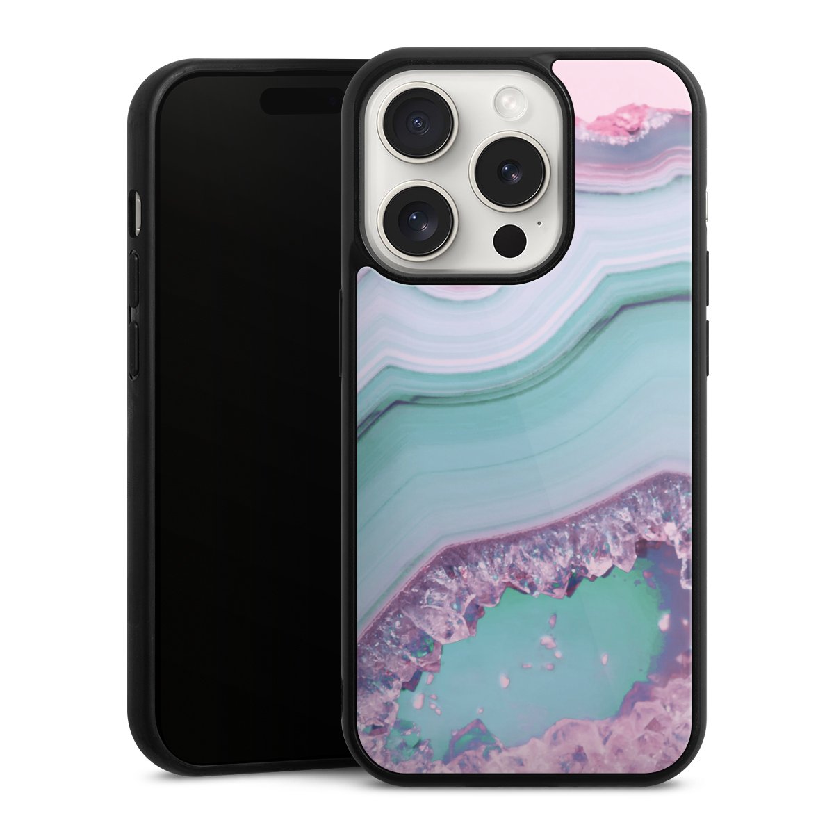 We print your design on the back of the glass inlay and then connect it firmly to the silicone case ,so that nothing sticks out and everything looks like it was cast from one piece. In addition, the sturdy glass element is protected from scratches by an additional coating and ensures a slight reflection on the shiny print image.