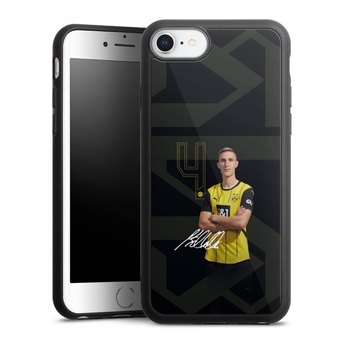 We print your design on the back of the glass inlay and then connect it firmly to the silicone case ,so that nothing sticks out and everything looks like it was cast from one piece. In addition, the sturdy glass element is protected from scratches by an additional coating and ensures a slight reflection on the shiny print image.