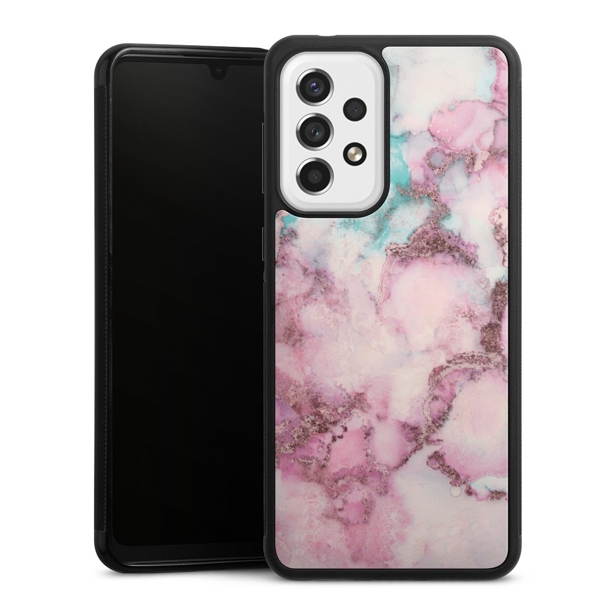 We print your design on the back of the glass inlay and then connect it firmly to the silicone case ,so that nothing sticks out and everything looks like it was cast from one piece. In addition, the sturdy glass element is protected from scratches by an additional coating and ensures a slight reflection on the shiny print image.