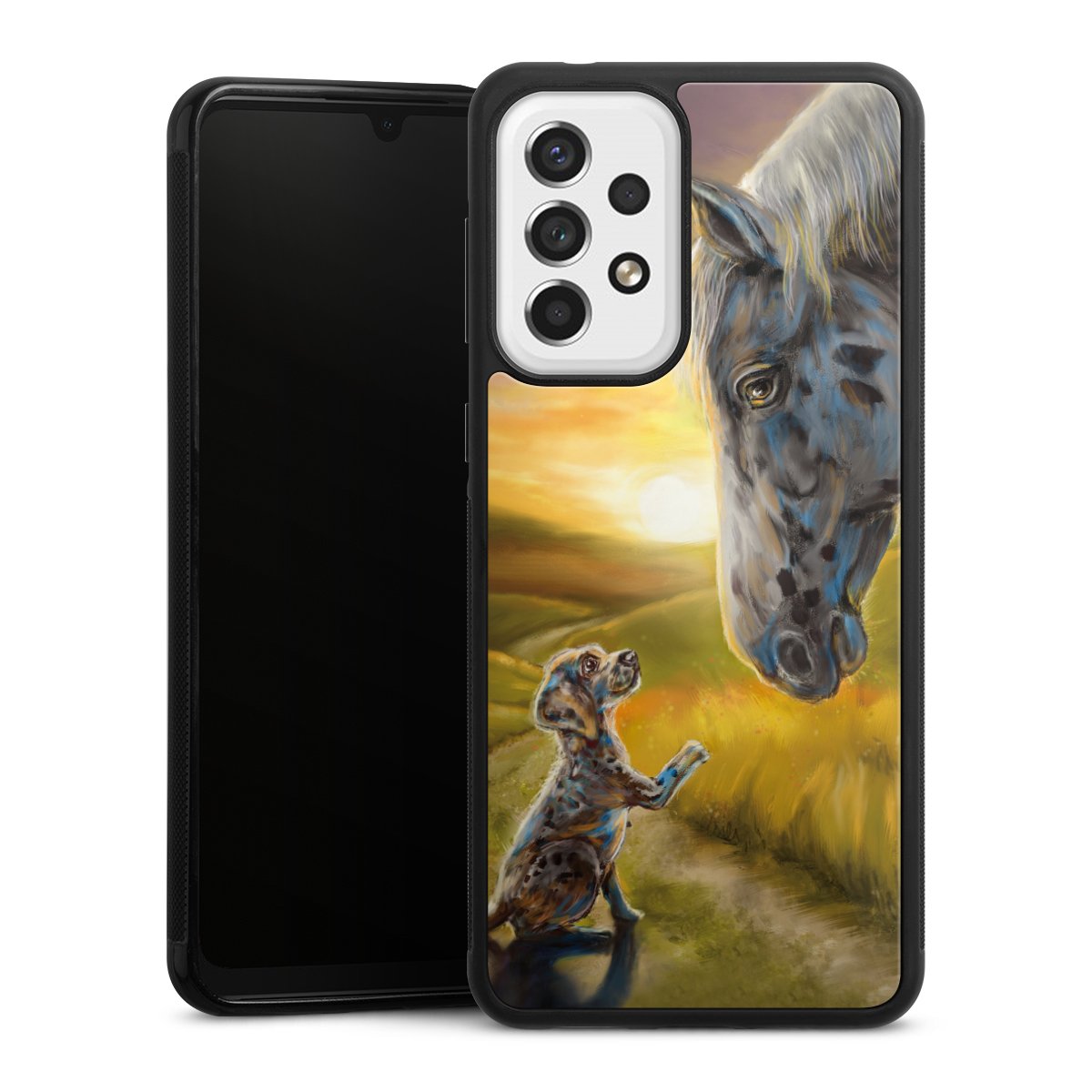 We print your design on the back of the glass inlay and then connect it firmly to the silicone case ,so that nothing sticks out and everything looks like it was cast from one piece. In addition, the sturdy glass element is protected from scratches by an additional coating and ensures a slight reflection on the shiny print image.