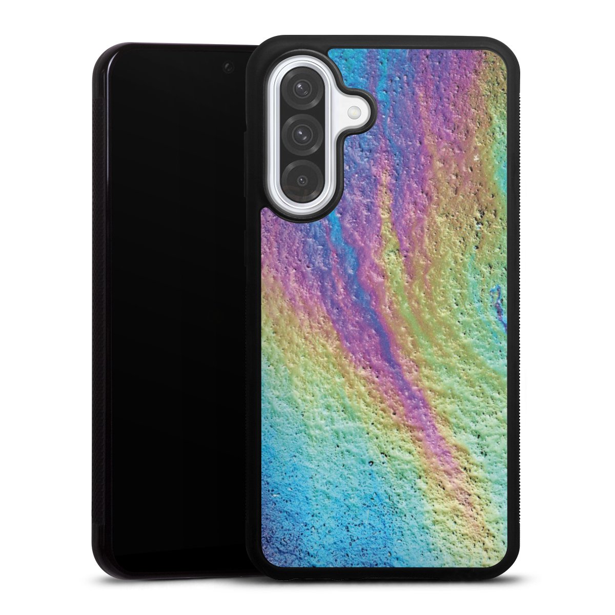 We print your design on the back of the glass inlay and then connect it firmly to the silicone case ,so that nothing sticks out and everything looks like it was cast from one piece. In addition, the sturdy glass element is protected from scratches by an additional coating and ensures a slight reflection on the shiny print image.