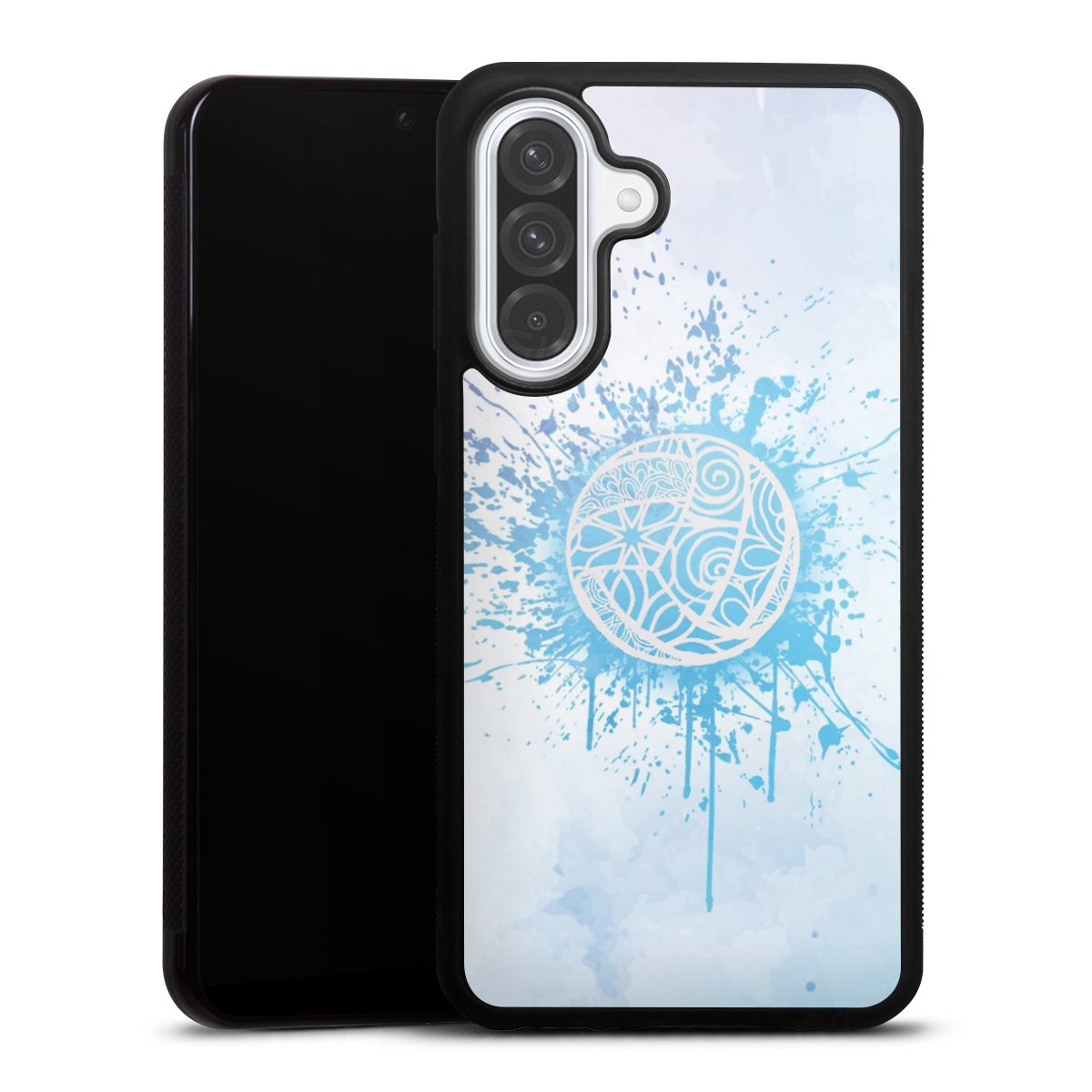 We print your design on the back of the glass inlay and then connect it firmly to the silicone case ,so that nothing sticks out and everything looks like it was cast from one piece. In addition, the sturdy glass element is protected from scratches by an additional coating and ensures a slight reflection on the shiny print image.