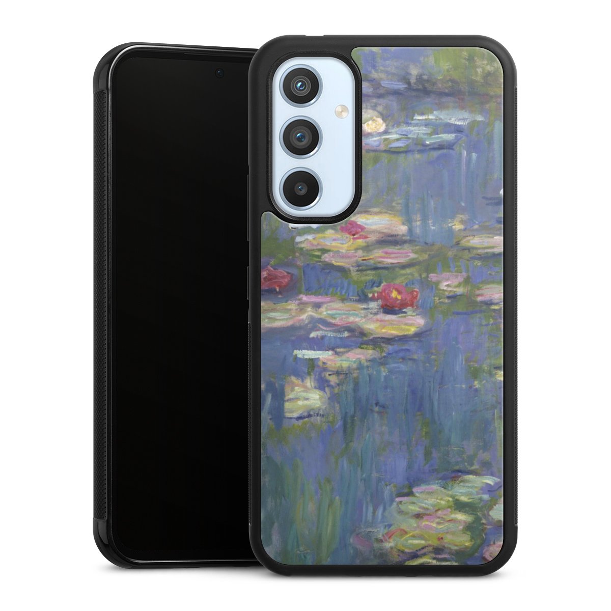 We print your design on the back of the glass inlay and then connect it firmly to the silicone case ,so that nothing sticks out and everything looks like it was cast from one piece. In addition, the sturdy glass element is protected from scratches by an additional coating and ensures a slight reflection on the shiny print image.