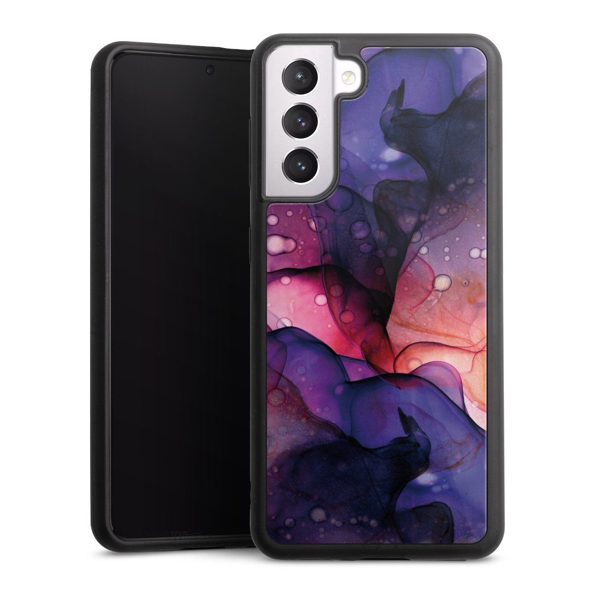We print your design on the back of the glass inlay and then connect it firmly to the silicone case ,so that nothing sticks out and everything looks like it was cast from one piece. In addition, the sturdy glass element is protected from scratches by an additional coating and ensures a slight reflection on the shiny print image.