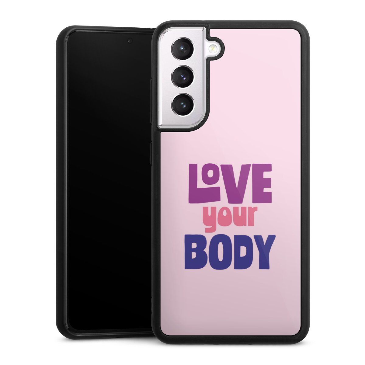 We print your design on the back of the glass inlay and then connect it firmly to the silicone case ,so that nothing sticks out and everything looks like it was cast from one piece. In addition, the sturdy glass element is protected from scratches by an additional coating and ensures a slight reflection on the shiny print image.