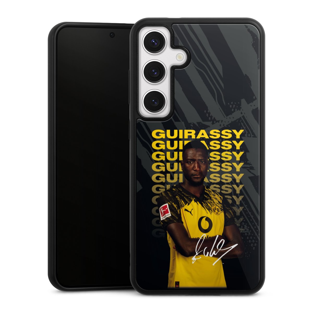We print your design on the back of the glass inlay and then connect it firmly to the silicone case ,so that nothing sticks out and everything looks like it was cast from one piece. In addition, the sturdy glass element is protected from scratches by an additional coating and ensures a slight reflection on the shiny print image.