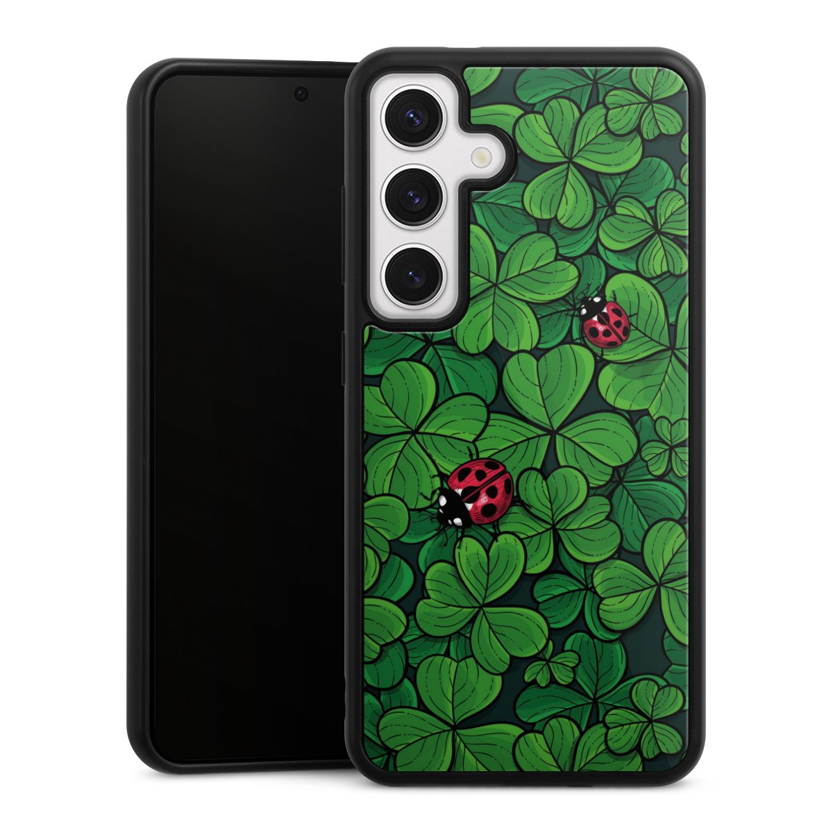 We print your design on the back of the glass inlay and then connect it firmly to the silicone case ,so that nothing sticks out and everything looks like it was cast from one piece. In addition, the sturdy glass element is protected from scratches by an additional coating and ensures a slight reflection on the shiny print image.