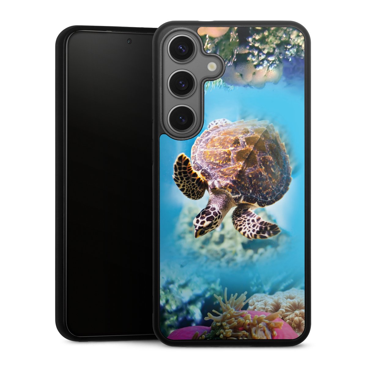 We print your design on the back of the glass inlay and then connect it firmly to the silicone case ,so that nothing sticks out and everything looks like it was cast from one piece. In addition, the sturdy glass element is protected from scratches by an additional coating and ensures a slight reflection on the shiny print image.