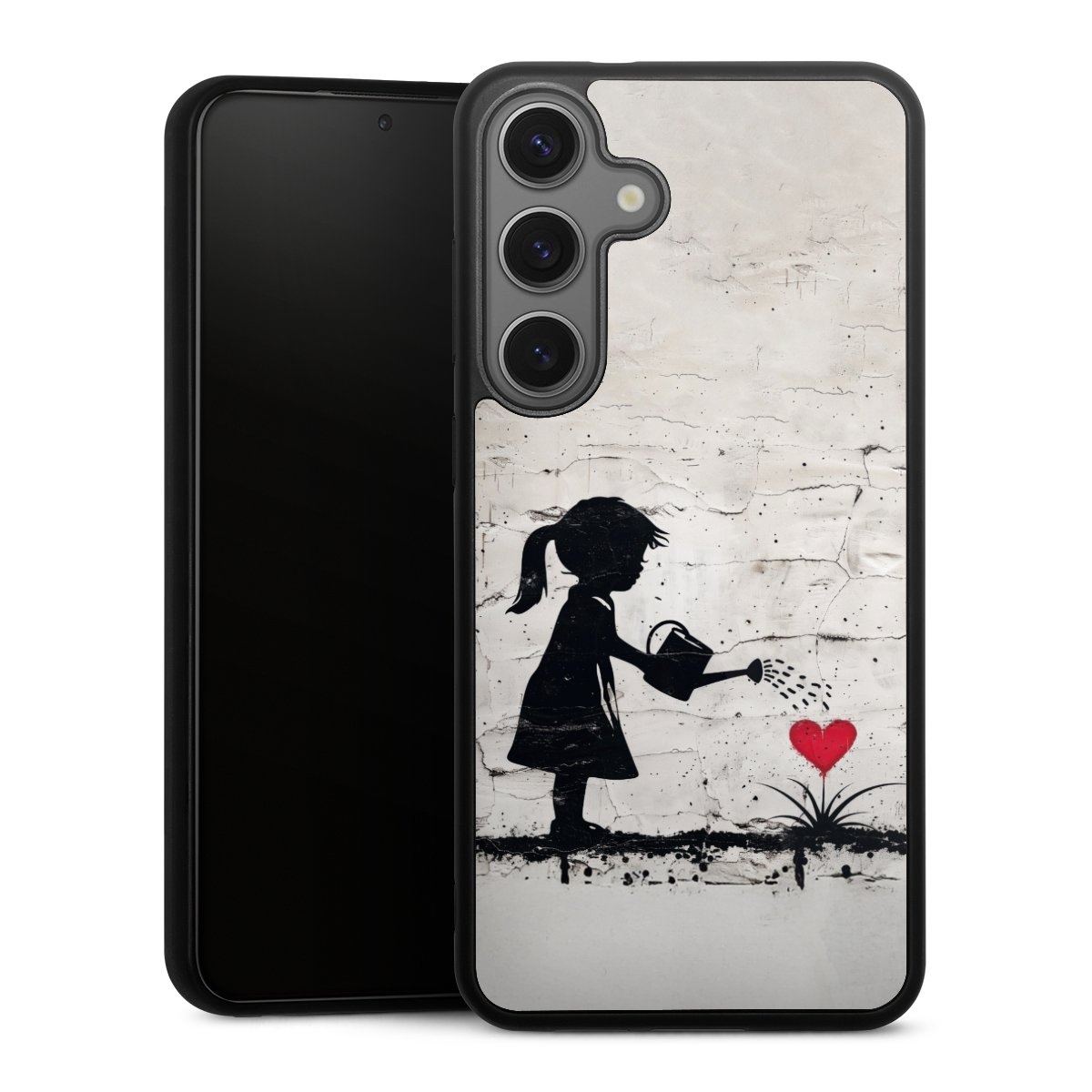 We print your design on the back of the glass inlay and then connect it firmly to the silicone case ,so that nothing sticks out and everything looks like it was cast from one piece. In addition, the sturdy glass element is protected from scratches by an additional coating and ensures a slight reflection on the shiny print image.