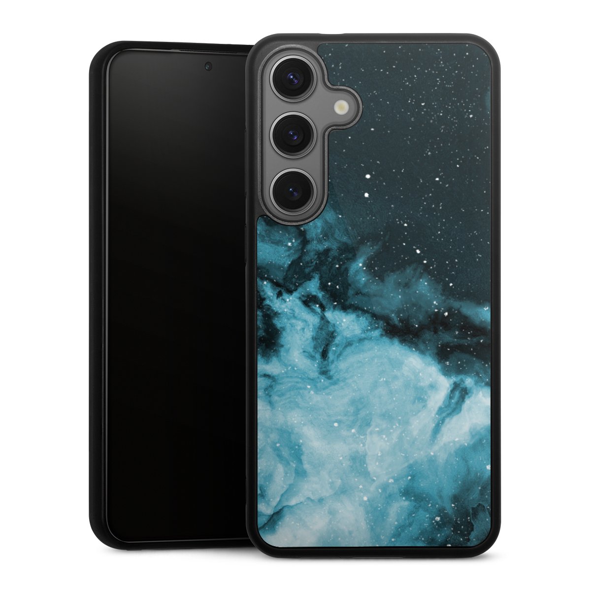 We print your design on the back of the glass inlay and then connect it firmly to the silicone case ,so that nothing sticks out and everything looks like it was cast from one piece. In addition, the sturdy glass element is protected from scratches by an additional coating and ensures a slight reflection on the shiny print image.