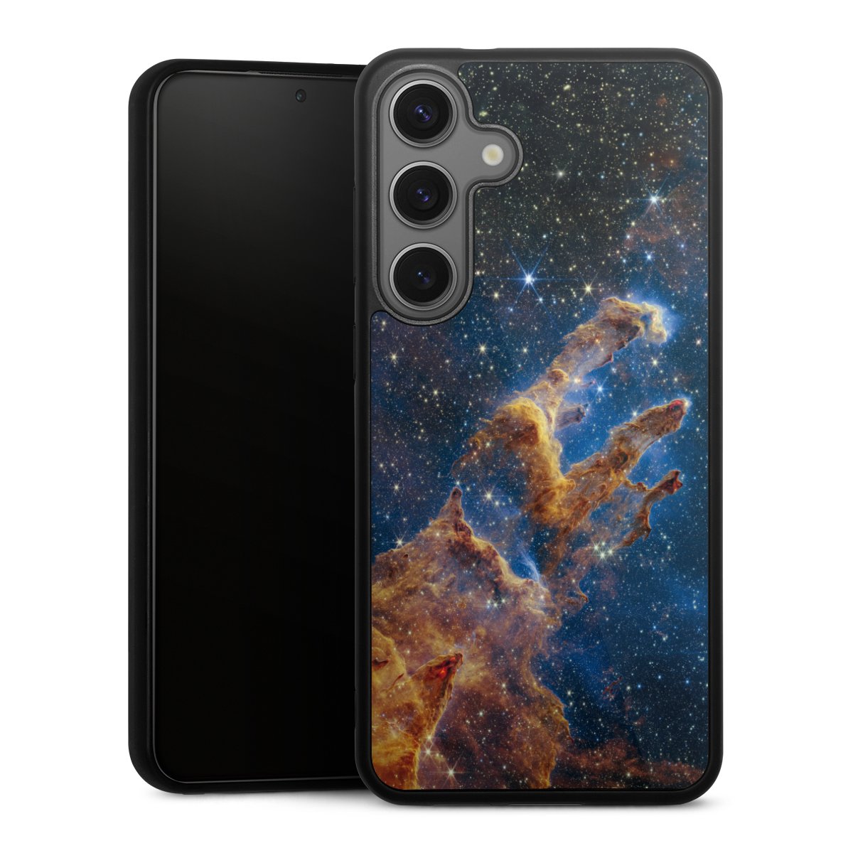 We print your design on the back of the glass inlay and then connect it firmly to the silicone case ,so that nothing sticks out and everything looks like it was cast from one piece. In addition, the sturdy glass element is protected from scratches by an additional coating and ensures a slight reflection on the shiny print image.