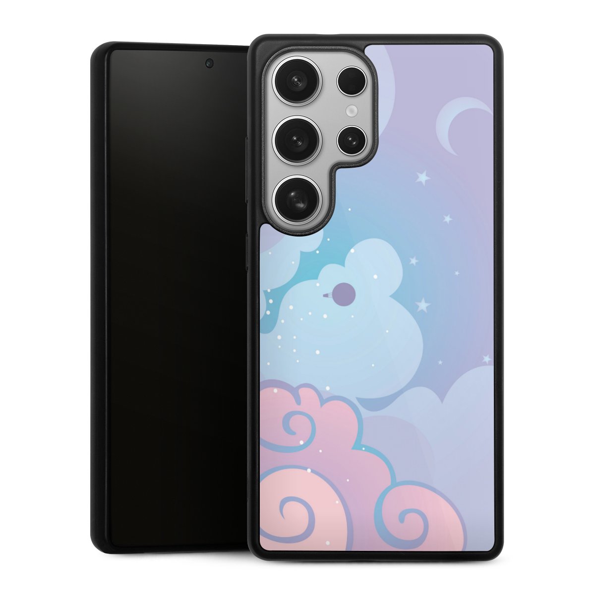 We print your design on the back of the glass inlay and then connect it firmly to the silicone case ,so that nothing sticks out and everything looks like it was cast from one piece. In addition, the sturdy glass element is protected from scratches by an additional coating and ensures a slight reflection on the shiny print image.