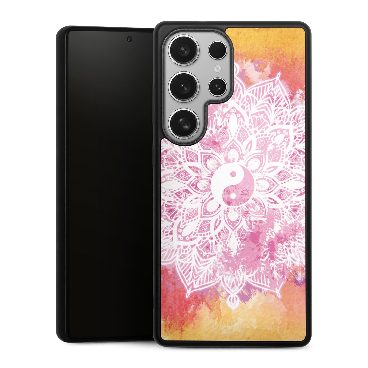 We print your design on the back of the glass inlay and then connect it firmly to the silicone case ,so that nothing sticks out and everything looks like it was cast from one piece. In addition, the sturdy glass element is protected from scratches by an additional coating and ensures a slight reflection on the shiny print image.