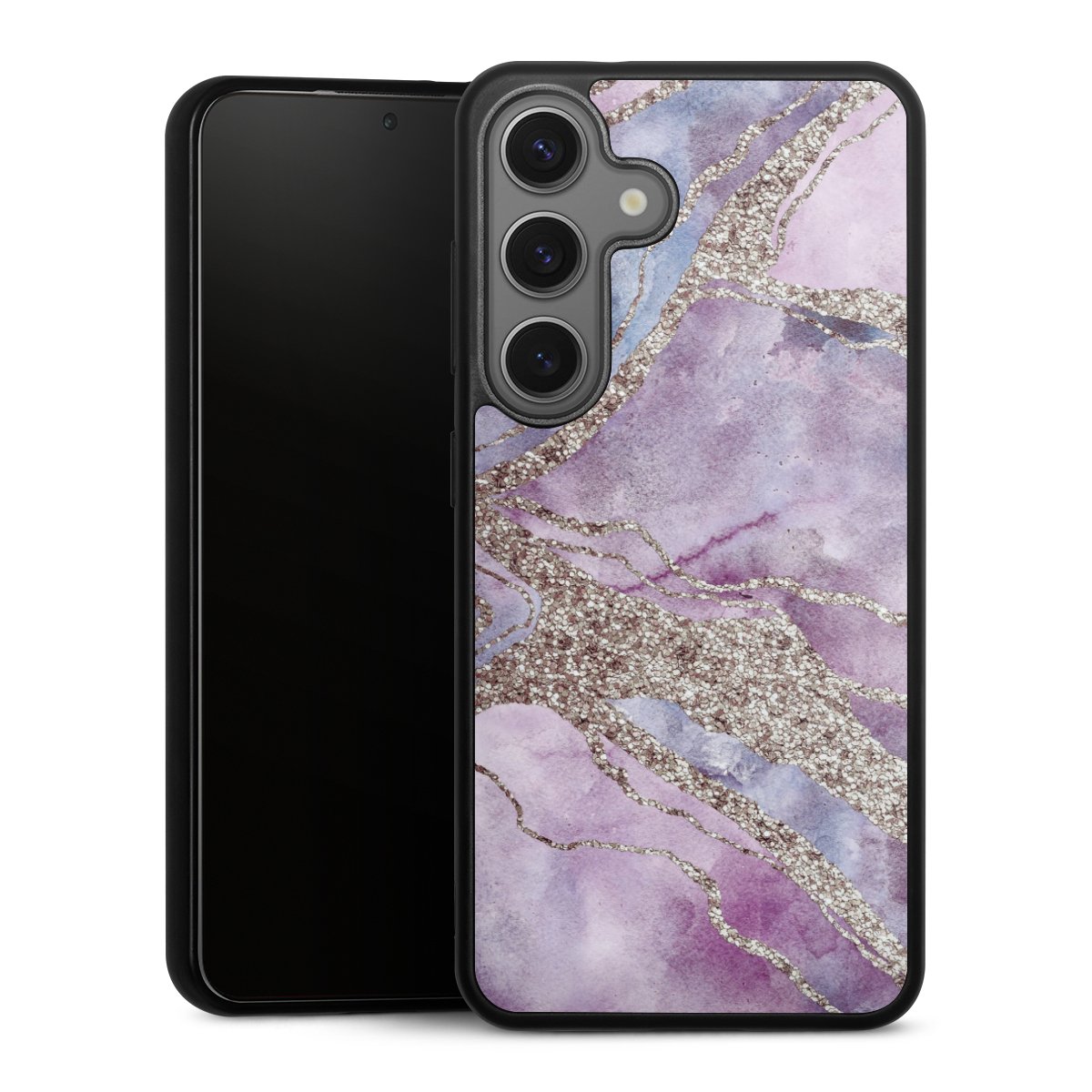 We print your design on the back of the glass inlay and then connect it firmly to the silicone case ,so that nothing sticks out and everything looks like it was cast from one piece. In addition, the sturdy glass element is protected from scratches by an additional coating and ensures a slight reflection on the shiny print image.