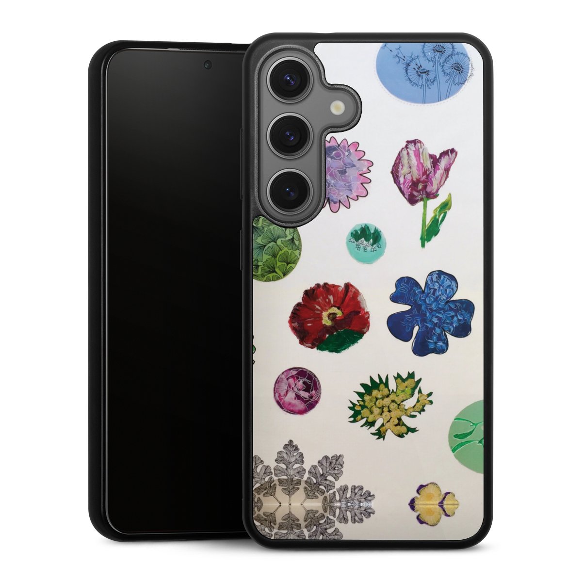 We print your design on the back of the glass inlay and then connect it firmly to the silicone case ,so that nothing sticks out and everything looks like it was cast from one piece. In addition, the sturdy glass element is protected from scratches by an additional coating and ensures a slight reflection on the shiny print image.