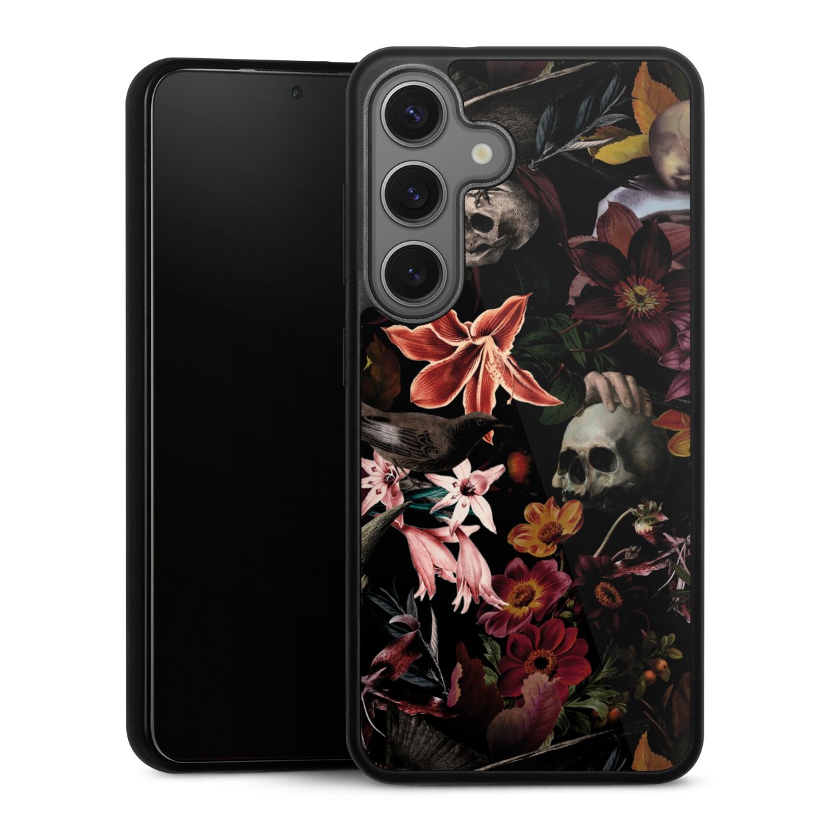 We print your design on the back of the glass inlay and then connect it firmly to the silicone case ,so that nothing sticks out and everything looks like it was cast from one piece. In addition, the sturdy glass element is protected from scratches by an additional coating and ensures a slight reflection on the shiny print image.