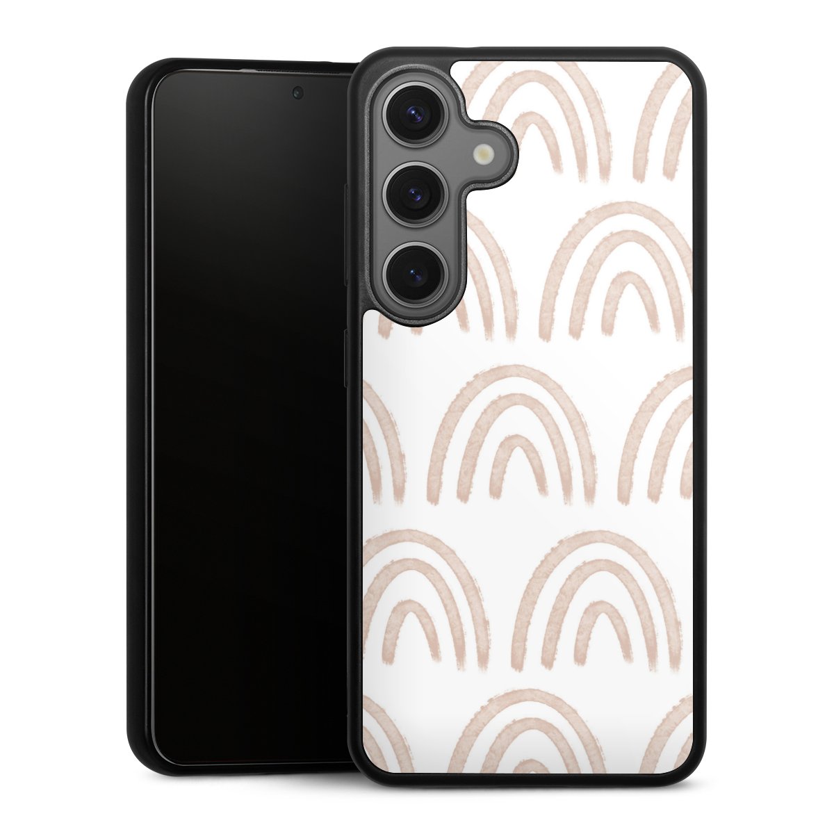 We print your design on the back of the glass inlay and then connect it firmly to the silicone case ,so that nothing sticks out and everything looks like it was cast from one piece. In addition, the sturdy glass element is protected from scratches by an additional coating and ensures a slight reflection on the shiny print image.
