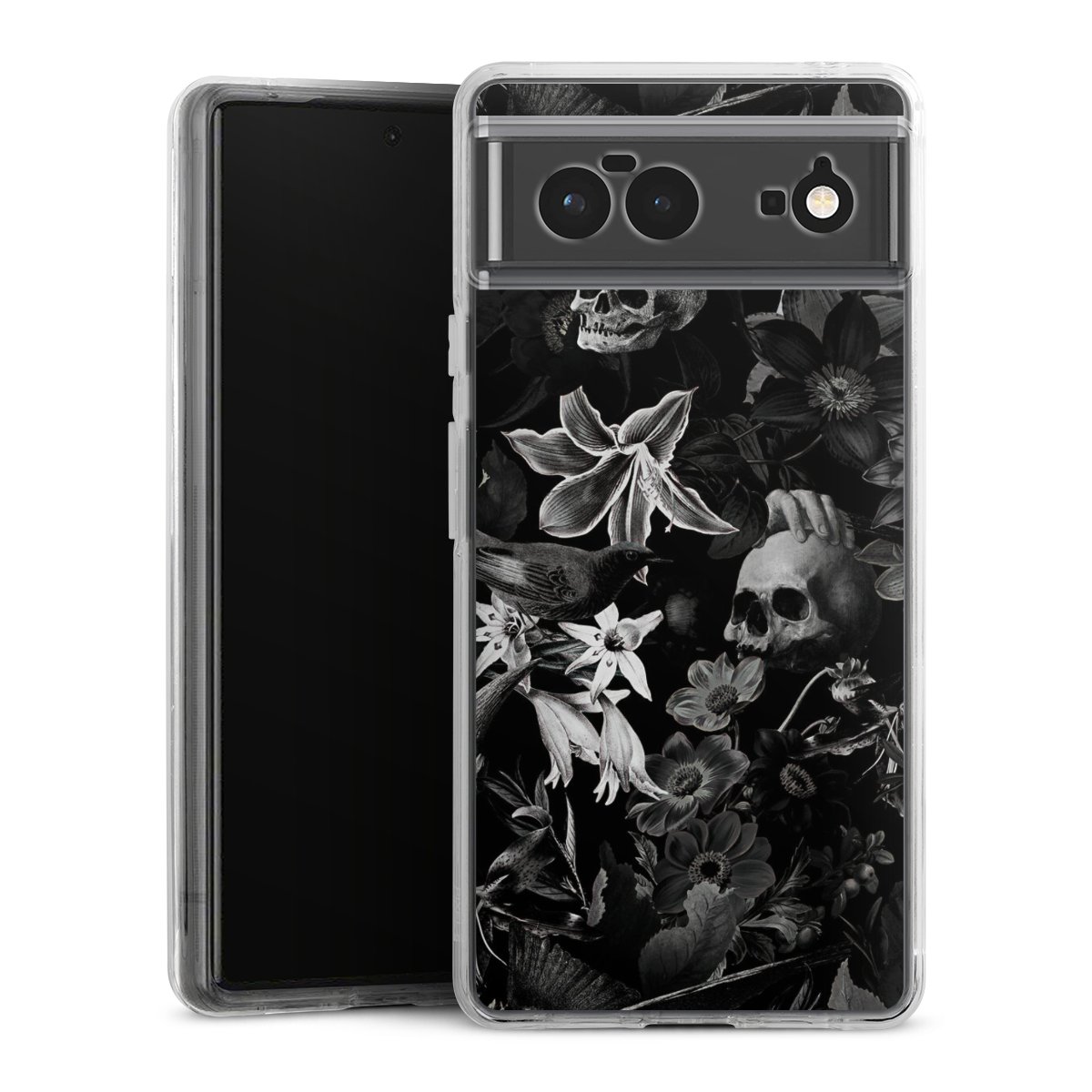 Skulls and Flowers on Black Background