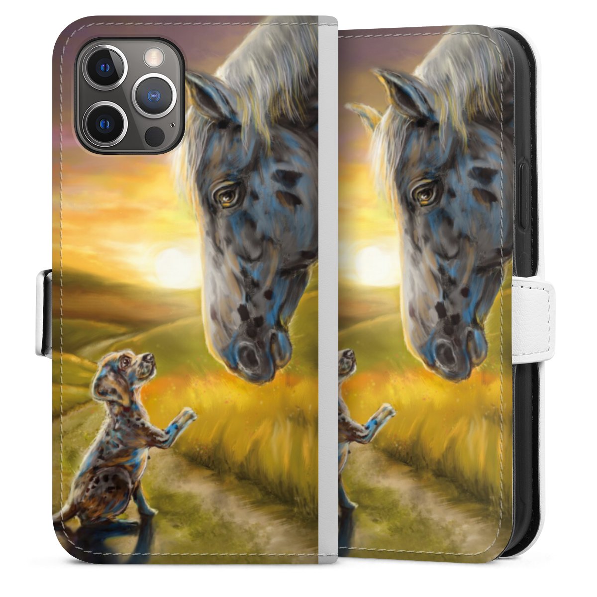 For our Sideflip Case we are using our advanced direct printing technology. The back and frontside are fully printabale, the inside of the phone bag is left unprinted. You can order the phone case without print, printed completely or also with a partial print.