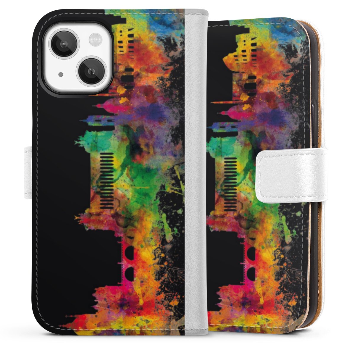 For our Sideflip Case we are using our advanced direct printing technology. The back and frontside are fully printabale, the inside of the phone bag is left unprinted. You can order the phone case without print, printed completely or also with a partial print.