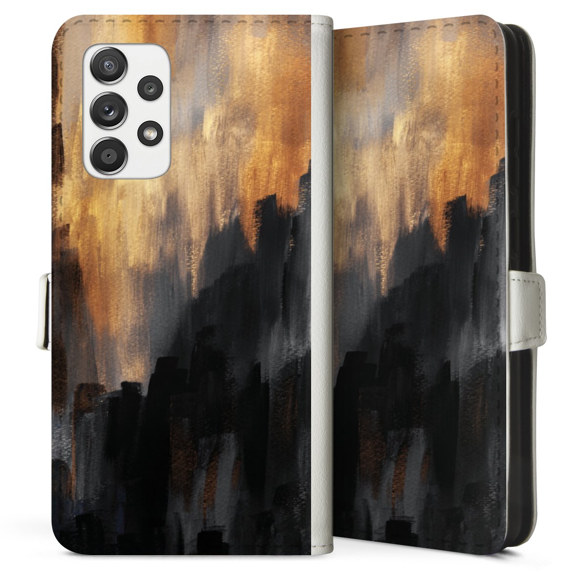 For our Sideflip Case we are using our advanced direct printing technology. The back and frontside are fully printabale, the inside of the phone bag is left unprinted. You can order the phone case without print, printed completely or also with a partial print.