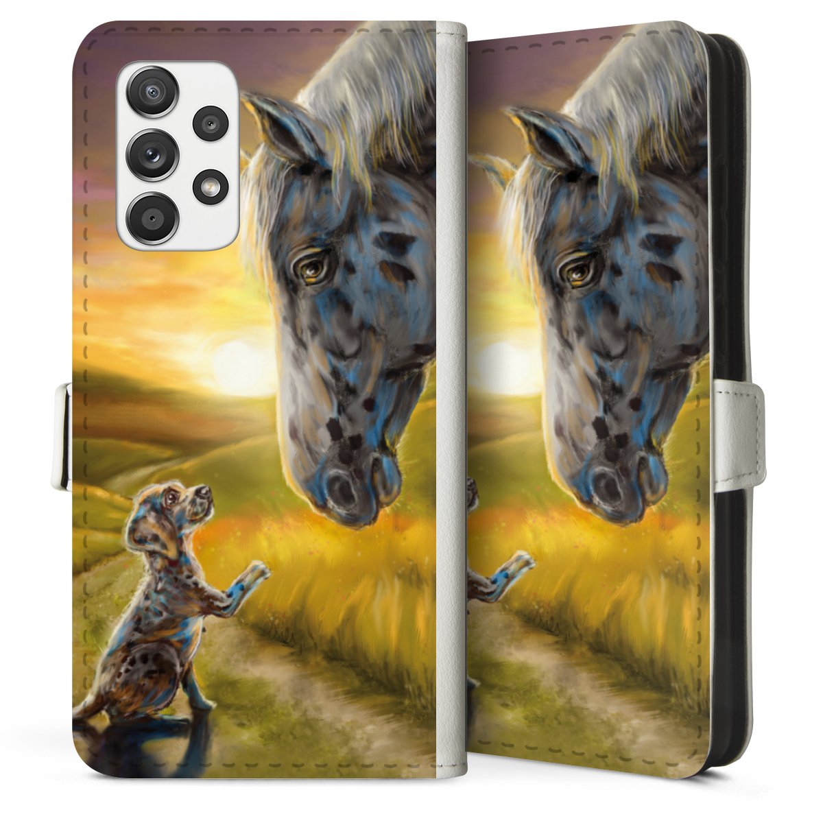 For our Sideflip Case we are using our advanced direct printing technology. The back and frontside are fully printabale, the inside of the phone bag is left unprinted. You can order the phone case without print, printed completely or also with a partial print.