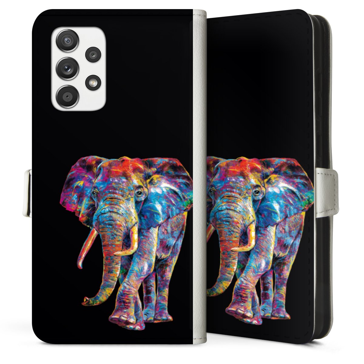 For our Sideflip Case we are using our advanced direct printing technology. The back and frontside are fully printabale, the inside of the phone bag is left unprinted. You can order the phone case without print, printed completely or also with a partial print.