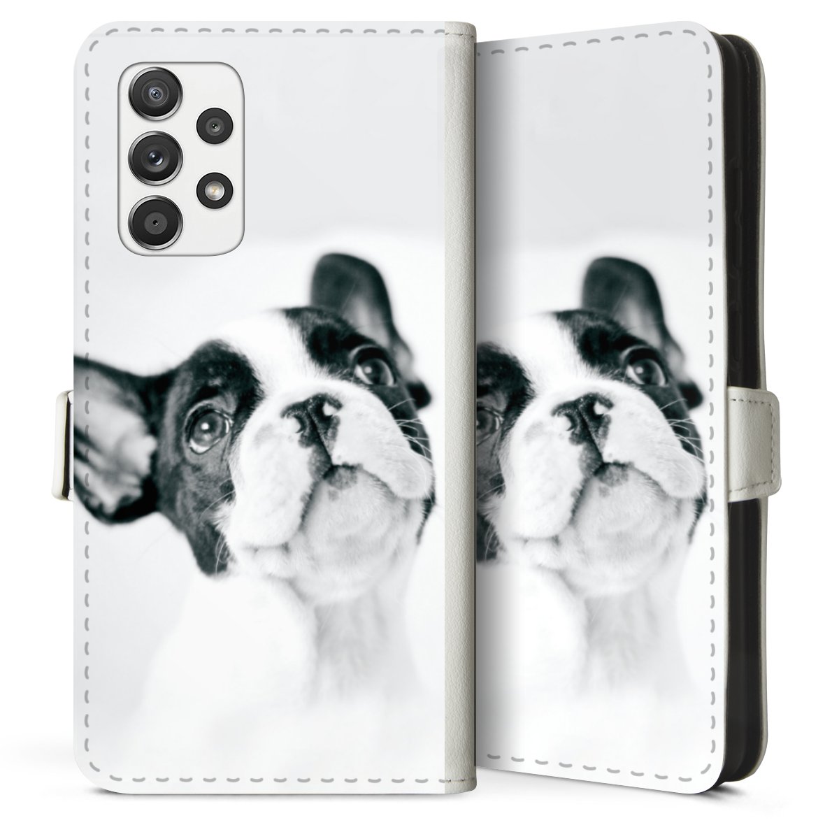 For our Sideflip Case we are using our advanced direct printing technology. The back and frontside are fully printabale, the inside of the phone bag is left unprinted. You can order the phone case without print, printed completely or also with a partial print.