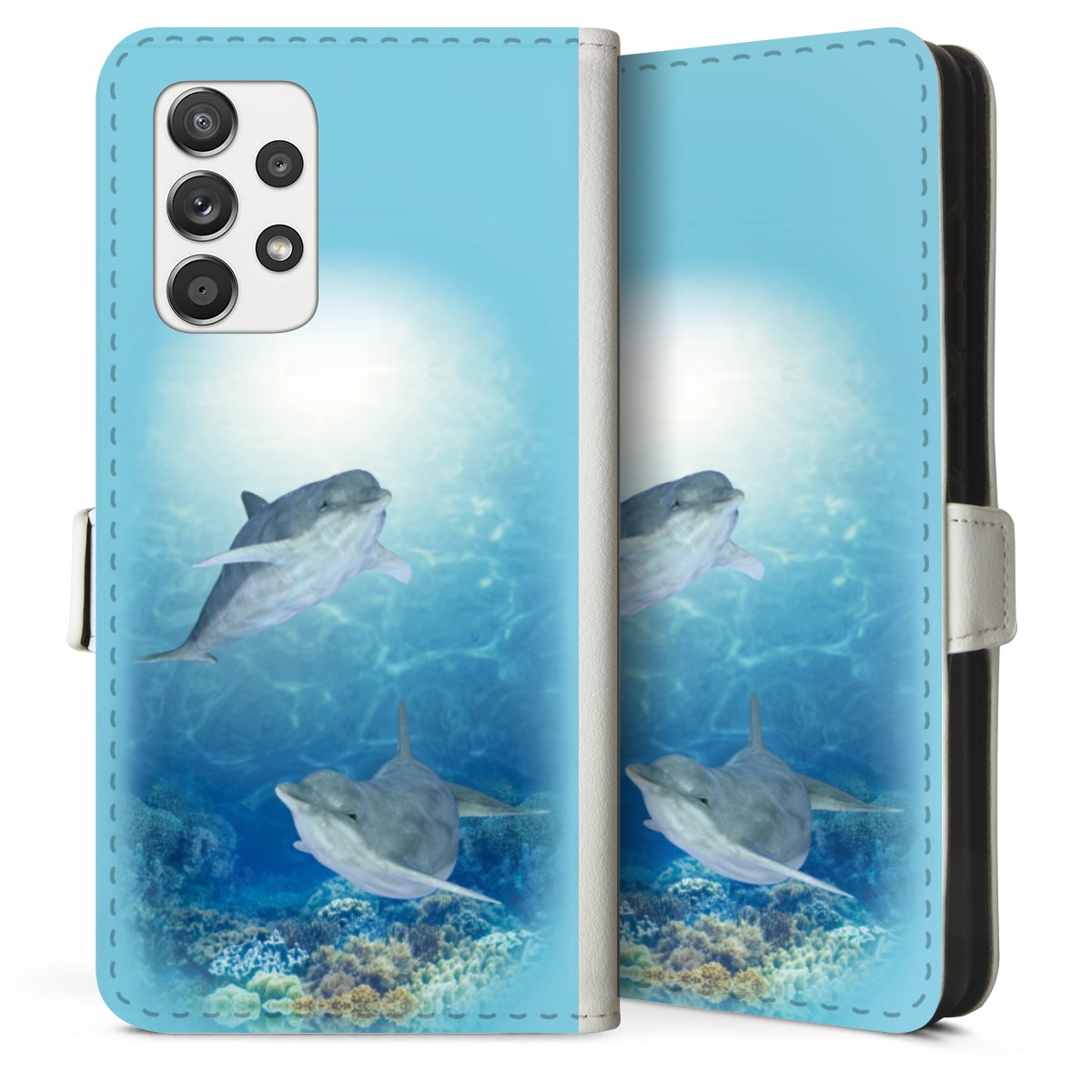 For our Sideflip Case we are using our advanced direct printing technology. The back and frontside are fully printabale, the inside of the phone bag is left unprinted. You can order the phone case without print, printed completely or also with a partial print.