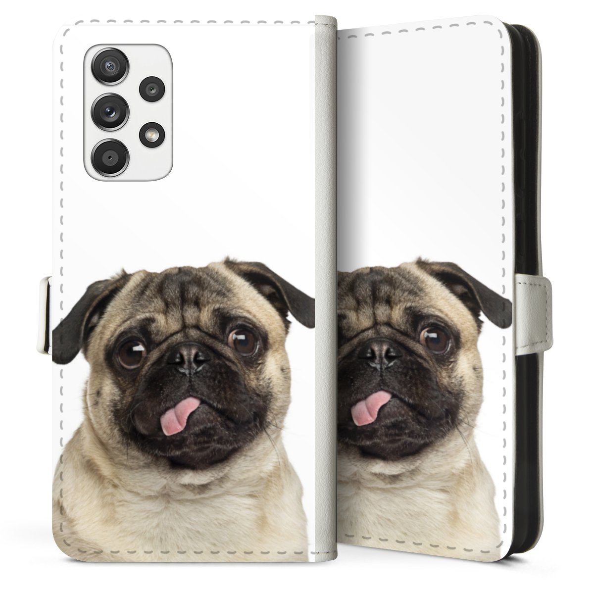 For our Sideflip Case we are using our advanced direct printing technology. The back and frontside are fully printabale, the inside of the phone bag is left unprinted. You can order the phone case without print, printed completely or also with a partial print.