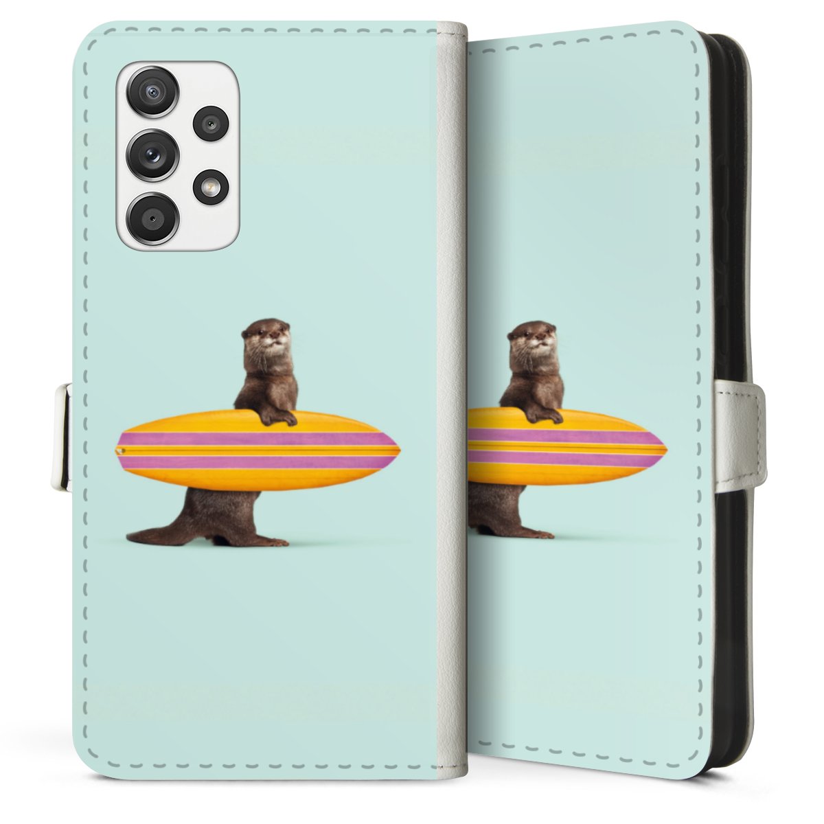 For our Sideflip Case we are using our advanced direct printing technology. The back and frontside are fully printabale, the inside of the phone bag is left unprinted. You can order the phone case without print, printed completely or also with a partial print.