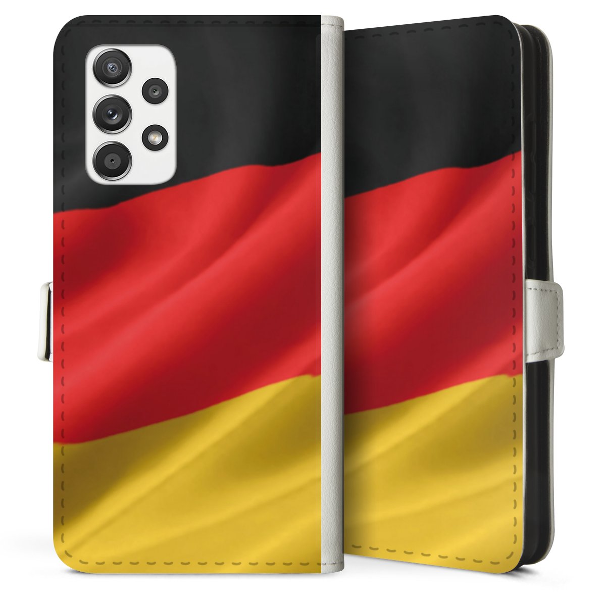For our Sideflip Case we are using our advanced direct printing technology. The back and frontside are fully printabale, the inside of the phone bag is left unprinted. You can order the phone case without print, printed completely or also with a partial print.