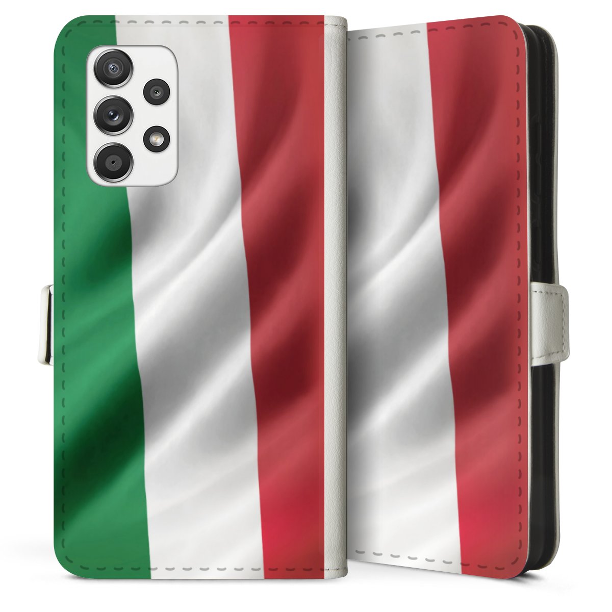 For our Sideflip Case we are using our advanced direct printing technology. The back and frontside are fully printabale, the inside of the phone bag is left unprinted. You can order the phone case without print, printed completely or also with a partial print.