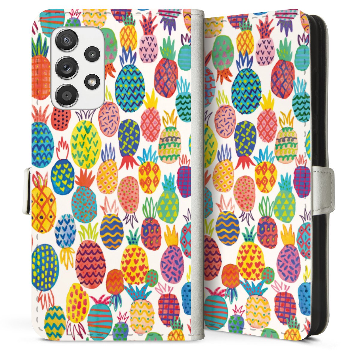 For our Sideflip Case we are using our advanced direct printing technology. The back and frontside are fully printabale, the inside of the phone bag is left unprinted. You can order the phone case without print, printed completely or also with a partial print.