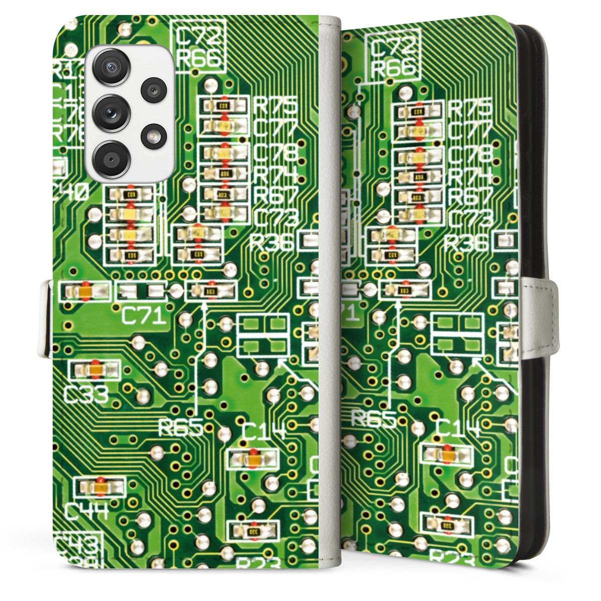 For our Sideflip Case we are using our advanced direct printing technology. The back and frontside are fully printabale, the inside of the phone bag is left unprinted. You can order the phone case without print, printed completely or also with a partial print.