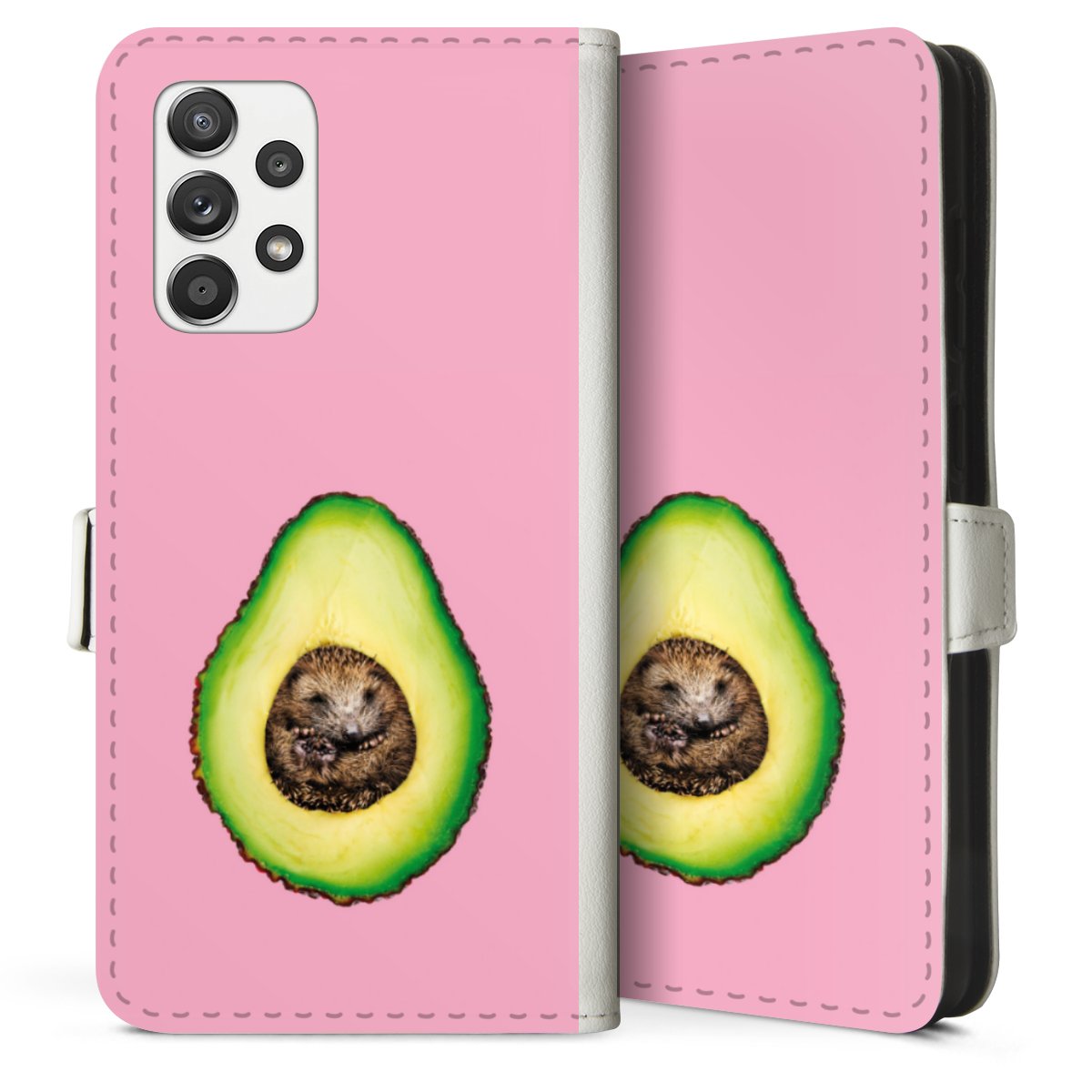 For our Sideflip Case we are using our advanced direct printing technology. The back and frontside are fully printabale, the inside of the phone bag is left unprinted. You can order the phone case without print, printed completely or also with a partial print.