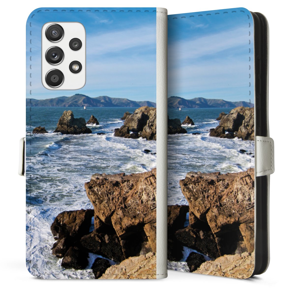 For our Sideflip Case we are using our advanced direct printing technology. The back and frontside are fully printabale, the inside of the phone bag is left unprinted. You can order the phone case without print, printed completely or also with a partial print.