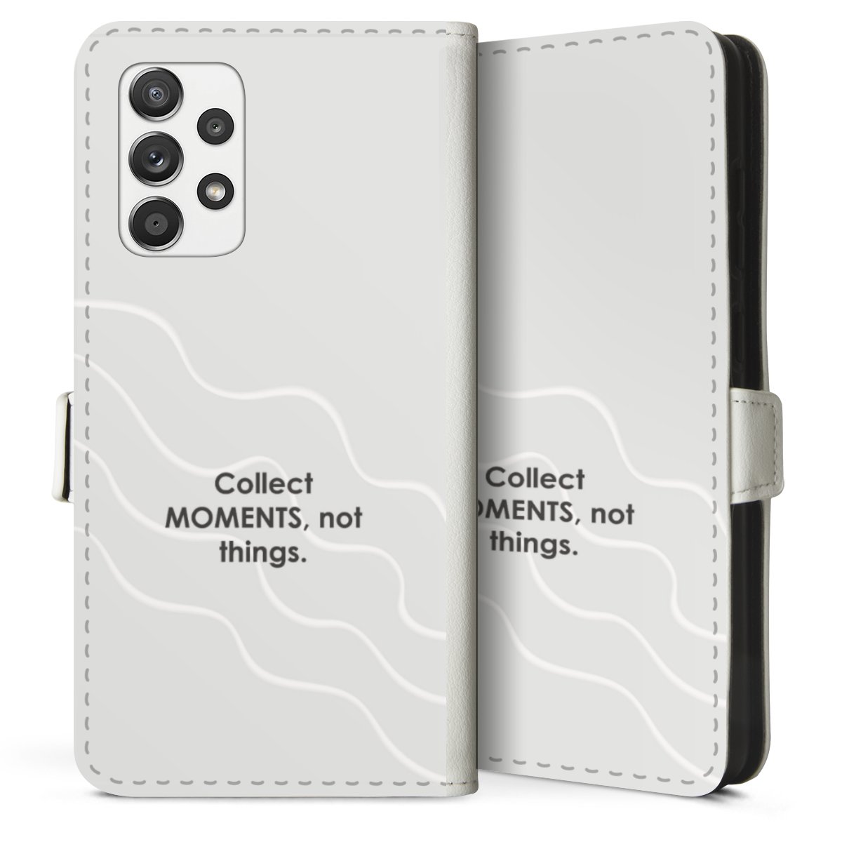 For our Sideflip Case we are using our advanced direct printing technology. The back and frontside are fully printabale, the inside of the phone bag is left unprinted. You can order the phone case without print, printed completely or also with a partial print.