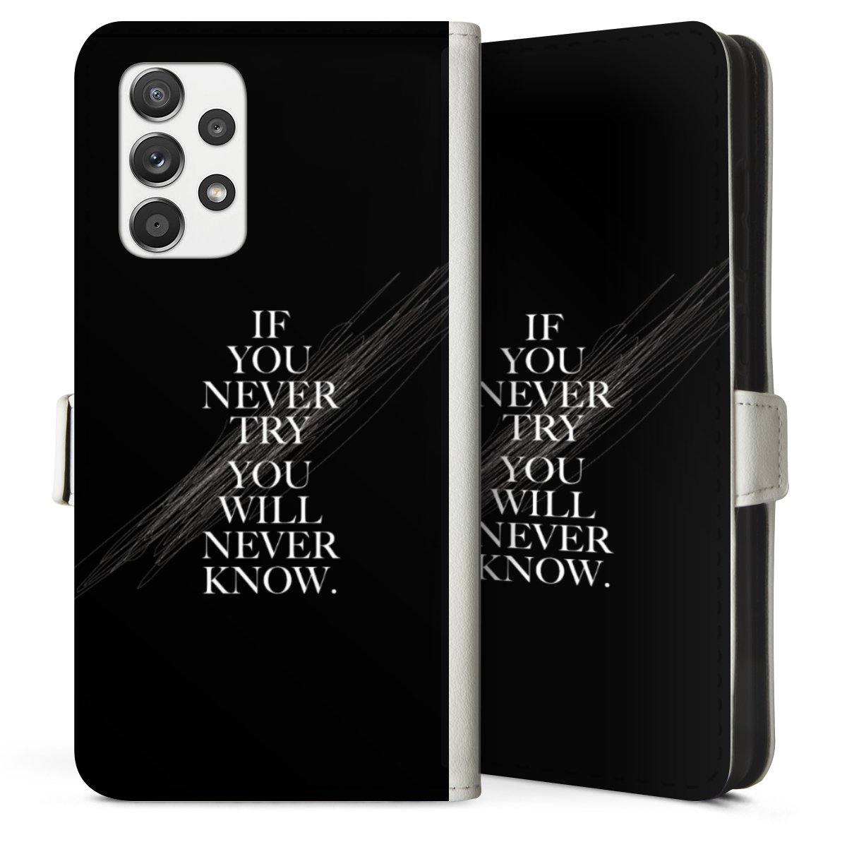 For our Sideflip Case we are using our advanced direct printing technology. The back and frontside are fully printabale, the inside of the phone bag is left unprinted. You can order the phone case without print, printed completely or also with a partial print.