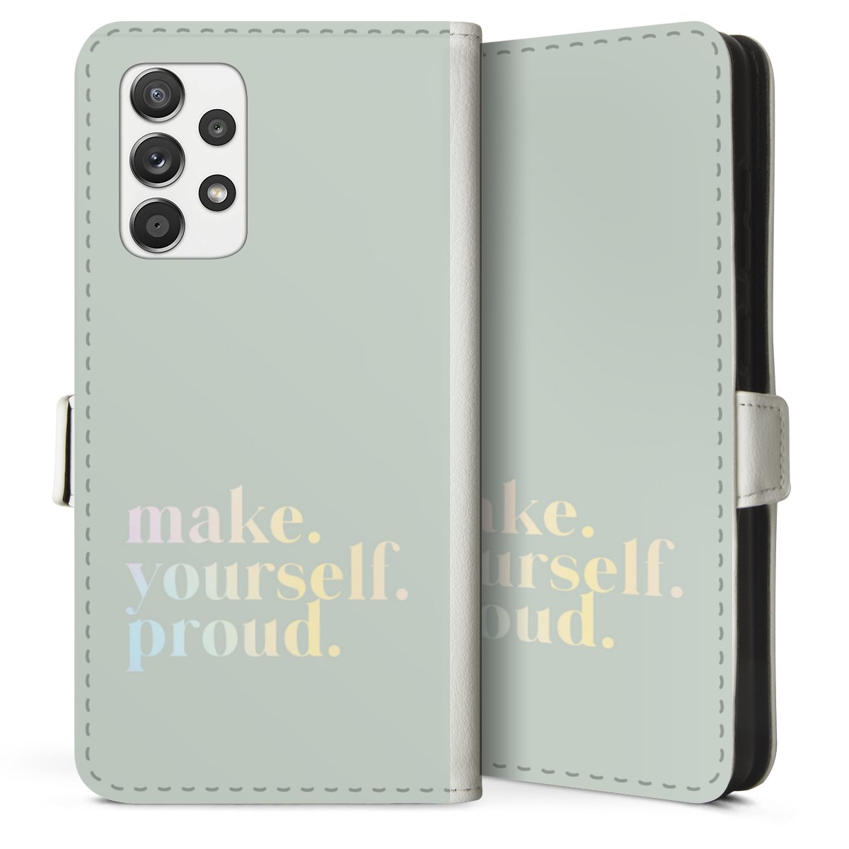 For our Sideflip Case we are using our advanced direct printing technology. The back and frontside are fully printabale, the inside of the phone bag is left unprinted. You can order the phone case without print, printed completely or also with a partial print.