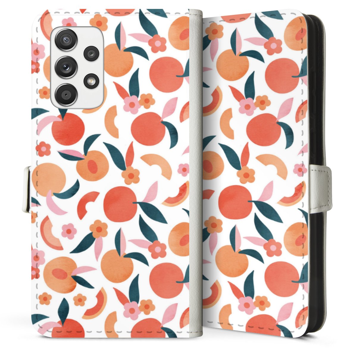 For our Sideflip Case we are using our advanced direct printing technology. The back and frontside are fully printabale, the inside of the phone bag is left unprinted. You can order the phone case without print, printed completely or also with a partial print.