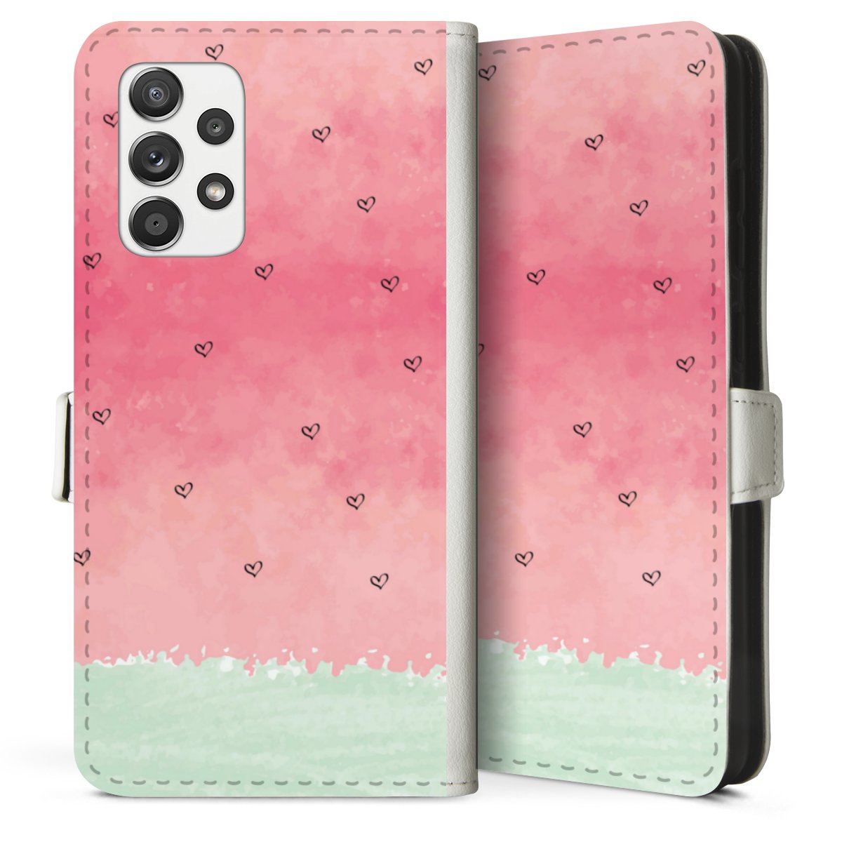 For our Sideflip Case we are using our advanced direct printing technology. The back and frontside are fully printabale, the inside of the phone bag is left unprinted. You can order the phone case without print, printed completely or also with a partial print.