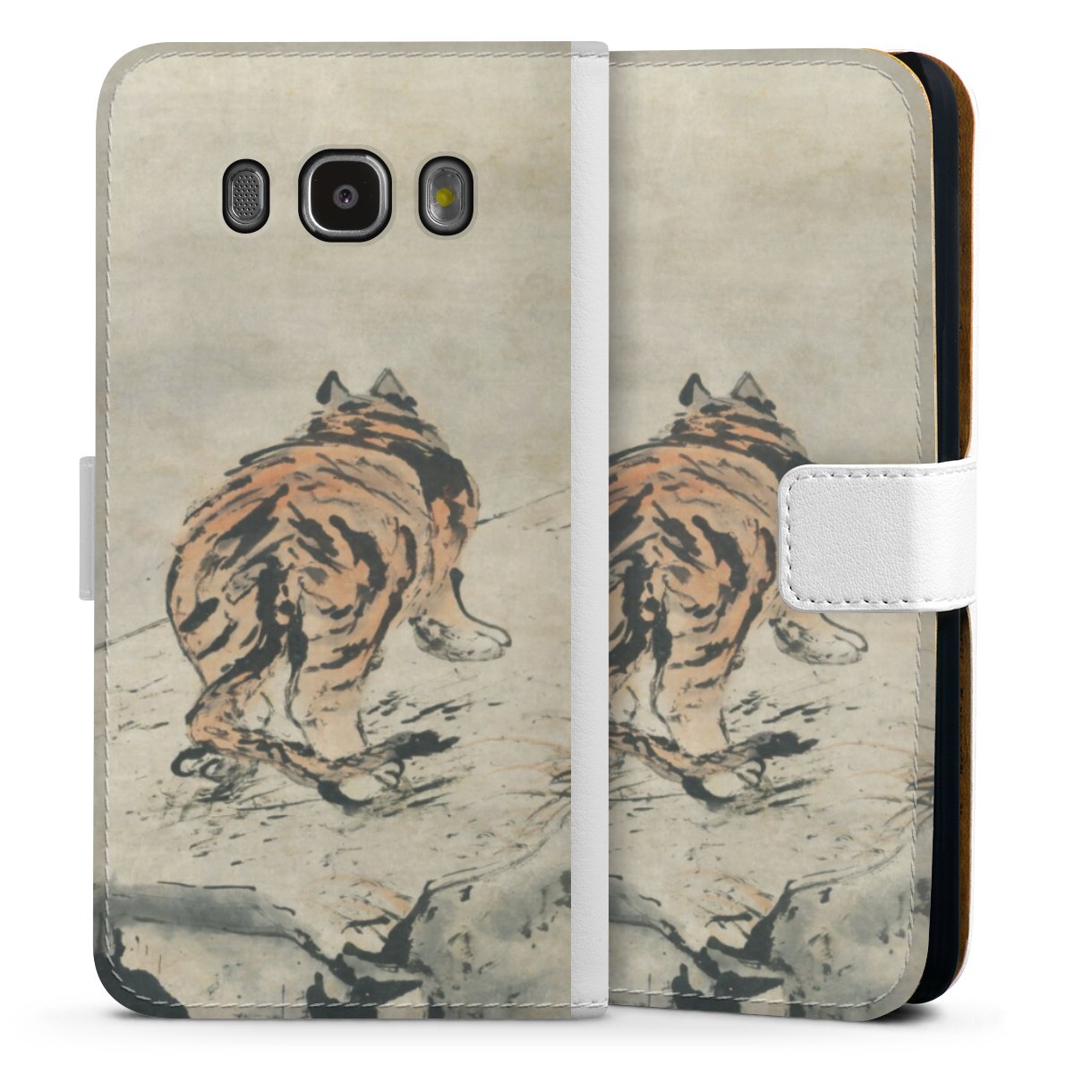 For our Sideflip Case we are using our advanced direct printing technology. The back and frontside are fully printabale, the inside of the phone bag is left unprinted. You can order the phone case without print, printed completely or also with a partial print.