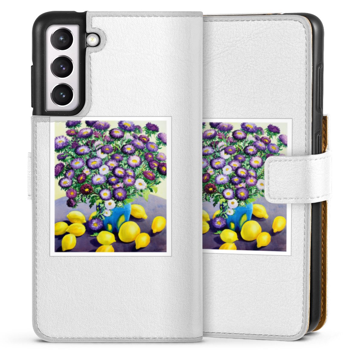 For our Sideflip Case we are using our advanced direct printing technology. The back and frontside are fully printabale, the inside of the phone bag is left unprinted. You can order the phone case without print, printed completely or also with a partial print.