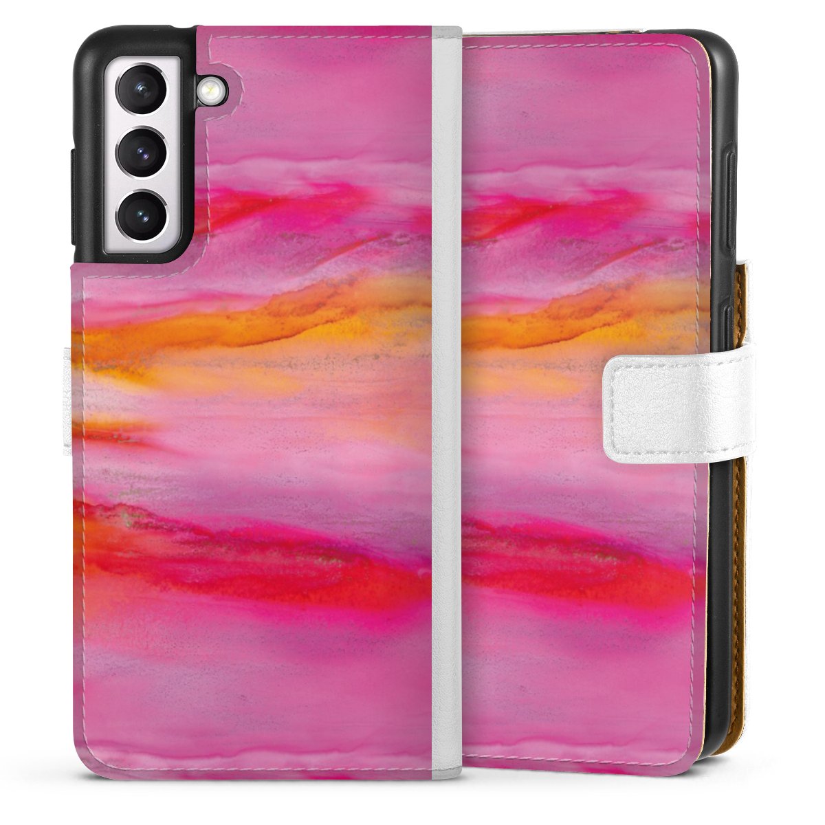 For our Sideflip Case we are using our advanced direct printing technology. The back and frontside are fully printabale, the inside of the phone bag is left unprinted. You can order the phone case without print, printed completely or also with a partial print.