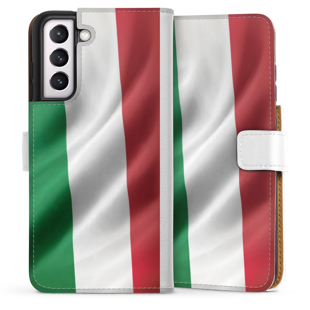 For our Sideflip Case we are using our advanced direct printing technology. The back and frontside are fully printabale, the inside of the phone bag is left unprinted. You can order the phone case without print, printed completely or also with a partial print.