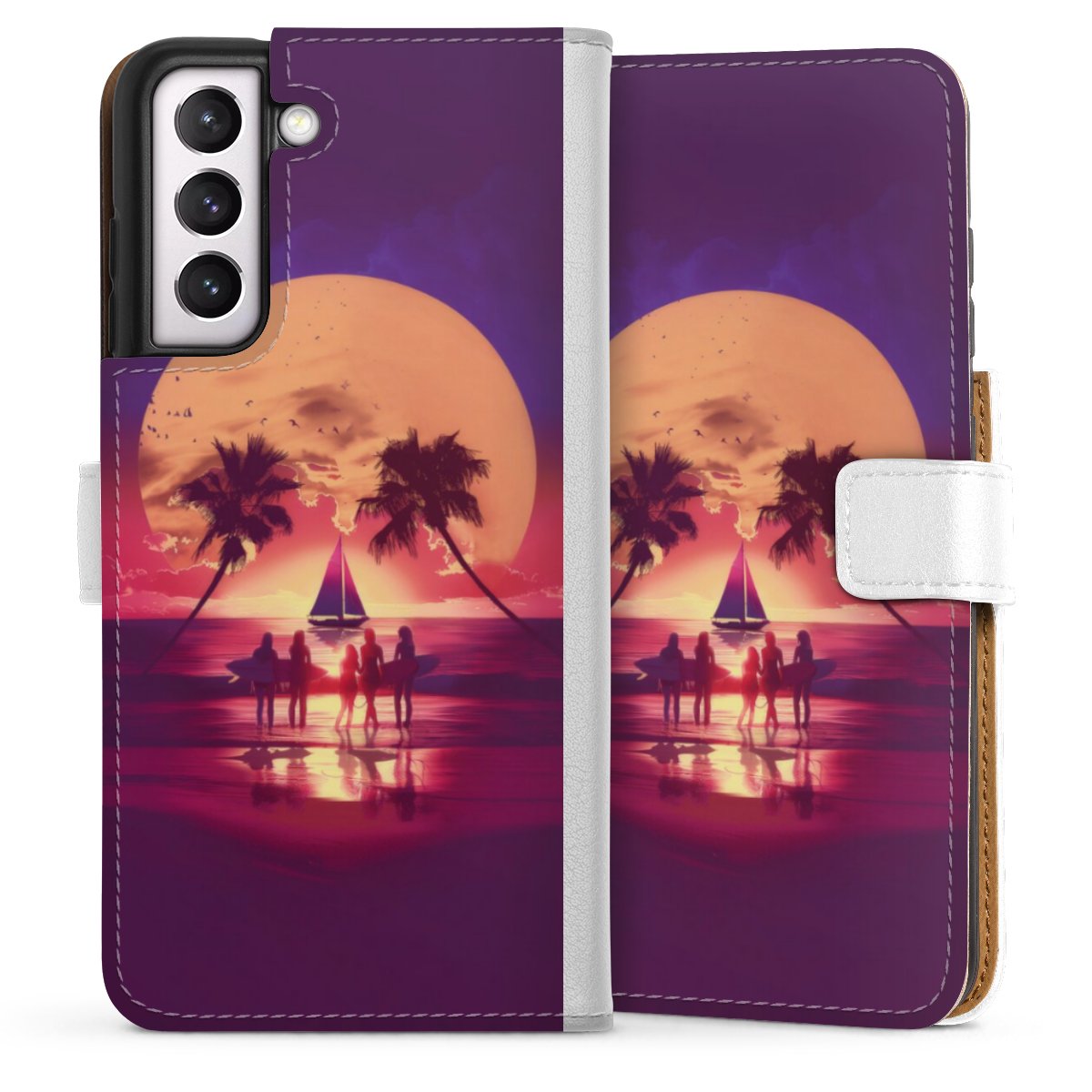 For our Sideflip Case we are using our advanced direct printing technology. The back and frontside are fully printabale, the inside of the phone bag is left unprinted. You can order the phone case without print, printed completely or also with a partial print.